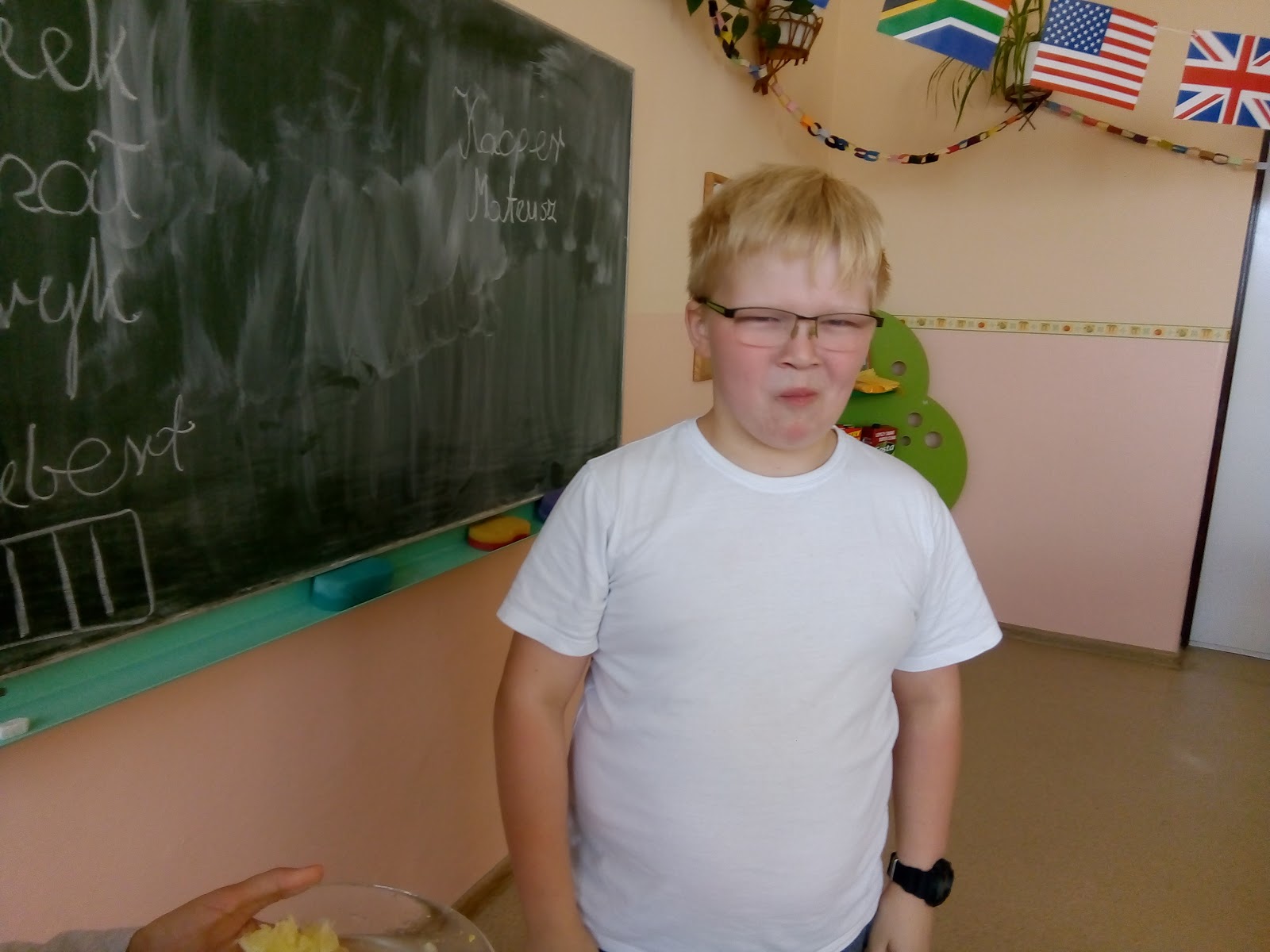 Po rozpakowaniu prezentów i degustacji babeczek i ciastek urządziliśmy konkurs dla chłopców, w którym nagrodą był Dyplom Mistrza słodkiej miny po zjedzeniu cytryny oraz zdjęcie zwycięzcy razem z dziewczynami. Chłopcy spisali się naprawdę dzielnie i jedząc cytrynę robili bardzo słodkie miny. W głosowaniu, jury w składzie dziewczyny z klasy IV zdecydowało, że zwycięzcą zostanie Hubert Grad.